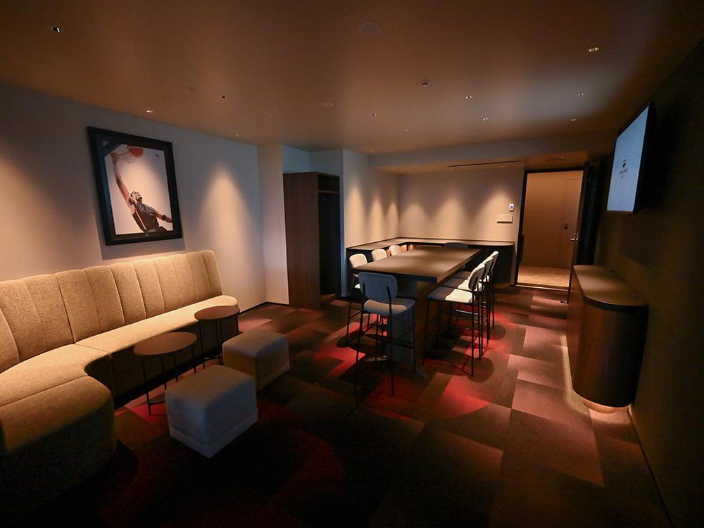 ロッカールームからコートに向かう選手をガラス越しに見ることができる大迫力のラウンジ空間です。ご自身で作るハンバーガーや、ホットドックなどをフィンガーフードをメインとしたお食事をご提供いたします。