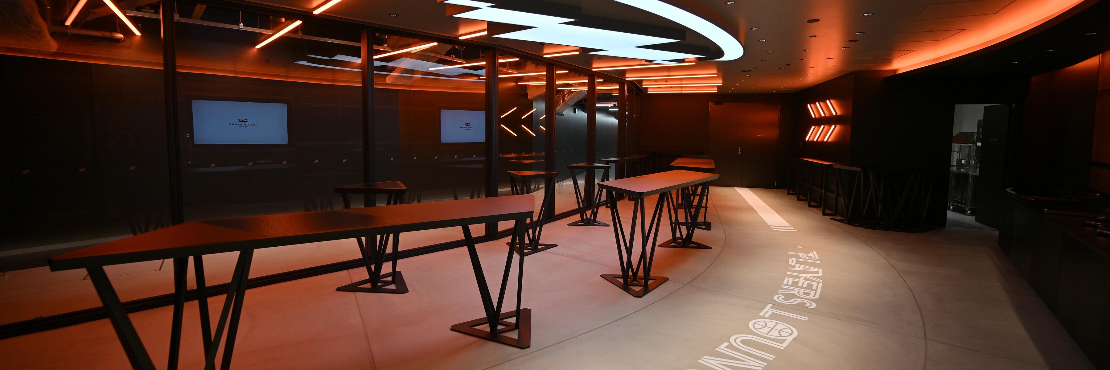 ロッカールームからコートに向かう選手をガラス越しに見ることができる大迫力のラウンジ空間です。ご自身で作るハンバーガーや、ホットドックなどをフィンガーフードをメインとしたお食事をご提供いたします。