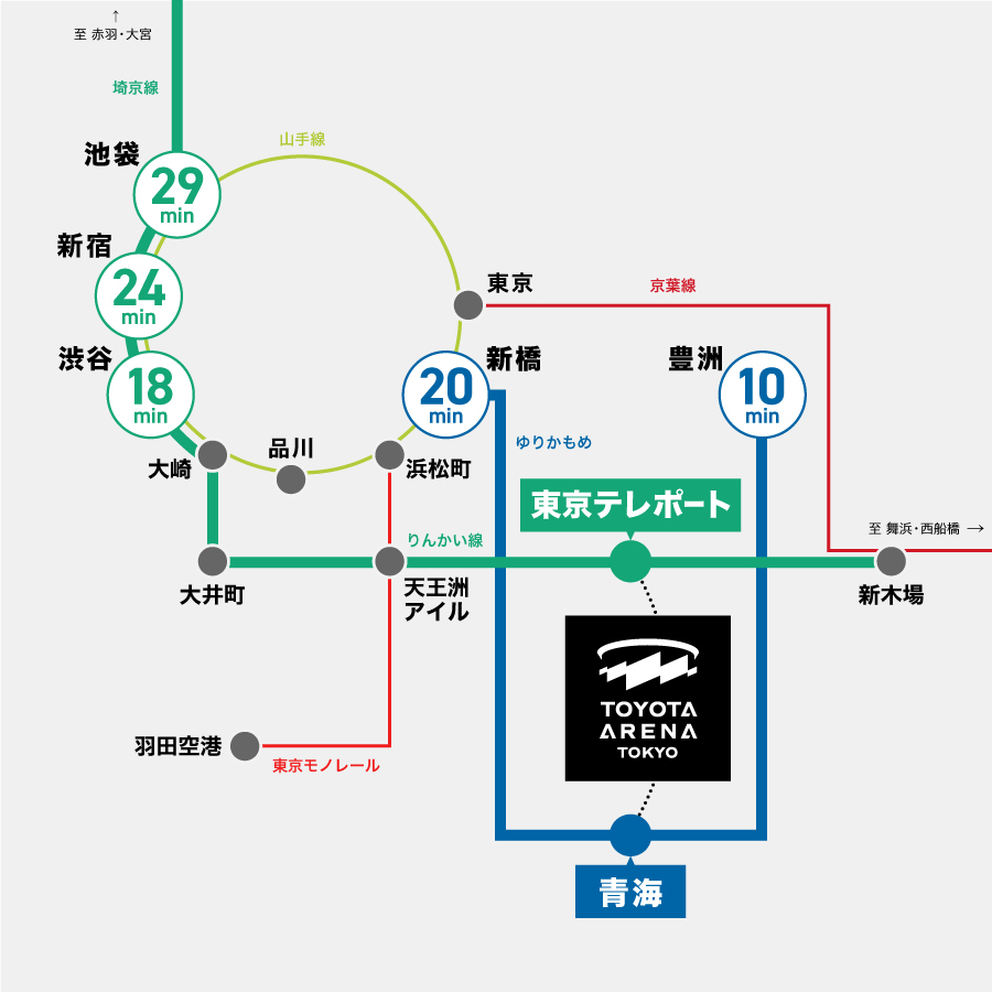 東京モノレールで「天王洲アイル」駅へ。りんかい線に乗り換え、「東京テレポート」駅下車 徒歩6分