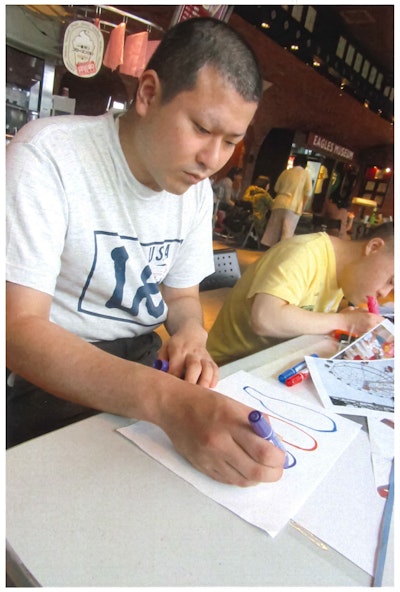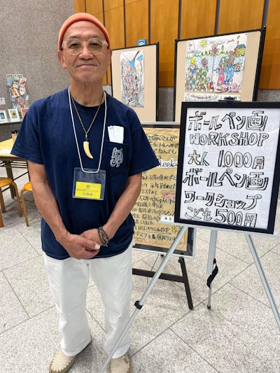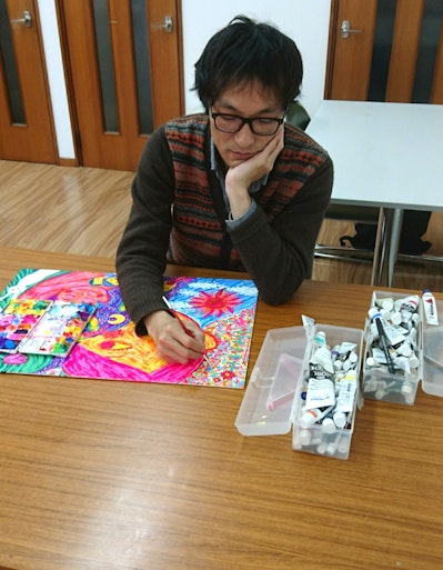 所属事業所の代表コメント:「上田さんは『乗り物』『未来のもの(なんでも)』が大好きなので、その好きなものを両方掛け合わせた未来っぽいデザインのe-palletには興味津々で筆も軽やかに楽しく描いていました。」